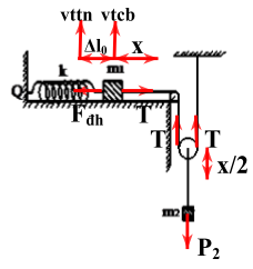 Viết phương trình định luật II Newton các lực tác dụng vào 2 vật, từ đó xác định được độ biến dạng, biên độ, tần số góc.