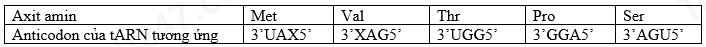 Một đoạn polipeptit có trình tự axit amin như sau: Met-Ser-Pro-Thr-Val. Bảng sau cho biết các anticodon của các tARN vận chuyển axit amin trong đoạn polipeptit đã cho: