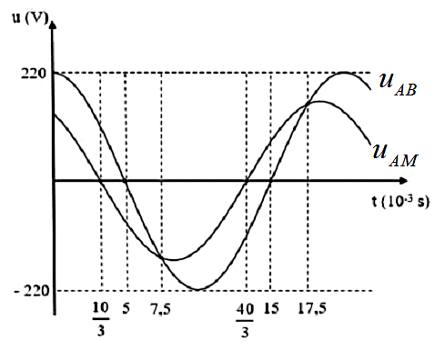 Cho mạch điện xoay chiều AB gồm hai đoạn mạch AM và MB. Đoạn mạch AB chỉ chứa các phần tử là điện trở, cuộn cảm và tụ điện mắc nối tiếp. Gọi \({u_{AB}}\) và \({u_{AM}}\) lần lượt là điện áp tức thời giữa hai đầu mạch AB và AM. Đồ thị biểu diễn sự phụ thuộc của các điện áp trên theo thời gian có dạng như hình bên. Cho biết trong mạch đang có cộng hưởng điện, cường độ dòng điện hiệu dụng trong mạch là \(\sqrt 2 \,\,A\) và \({u_{AM}}\) sớm pha so với \({u_{AB}}\). Công suất tiêu thụ điện ở đoạn mạch MB là