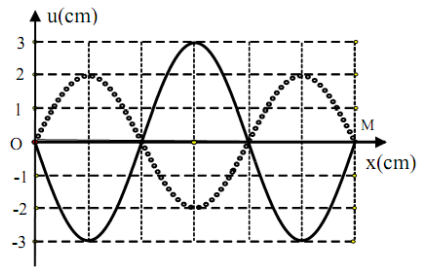 Cho một sợi dây có chiều dài 45cm đang có sóng dừng với hai đầu O và M là nút sóng như hình vẽ. Biết đường nét liền là hình ảnh sóng tại thời điểm t1, đường nét đứt là hình ảnh sóng tại thời điểm \({t_2} = {t_1} + 0,5\,\,\left( s \right)\), \(\omega \) là tần só góc của sóng. N là một phần tử dây ở điểm bụng. Biết \({t_1}\) và \({t_2}\) là hai thời điểm liên tiếp gần nhau nhất phần tử N có vận tốc dao động là \({v_1} = - \dfrac{2}{3}\omega {u_1}\) và \({v_2} = \dfrac{3}{2}\omega {u_2}\). Điểm P là một phần tử trên dây cách N một đoạn 5cm có gia tốc cực đại gần nhất với giá trị nào sau đây?