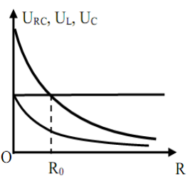 Đặt điện áp xoay chiều có giá trị hiệu dụng và tần số không đổi vào hai đầu đoạn mạch AB mắc nối tiếp theo thứ tự gồm cuộn cảm thuần có độ tự cảm L, điện trở R và tụ điện có điện dung C. Gọi \({U_{RC}}\) là điện áp hiệu dụng ở hai đầu đoạn mạch gồm tụ điện và biến trở, \({U_C}\) là điện áp hiệu dụng ở hai đầu tụ điện, \({U_L}\) là điện áp hiệu dụng hai đầu cuộn cảm thuần. Hình bên là đồ thị biểu điễn sự phụ thuộc của \({U_{RC}},\,\,{U_L},\,\,{U_C}\) theo giá trị của biến trở R. Khi \(R = 2{R_0}\) thì hệ số công suất của mạch gần nhất với giá trị nào sau đây?