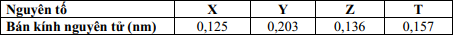 Cho X, Y, Z, T là các nguyên tố khác nhau trong số bốn nguyên tố: 11Na, 12Mg, 13Al, 19K và các tính chất được ghi trong bảng sau: