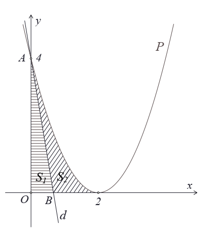 Cho (H) là hình phẳng giới hạn bởi đồ thị hàm số \(y = {x^2} - 4x + 4\), trục hoành và trục tung. Đường thẳng d qua A(0;4) và có hệ số góc k \((k \in \mathbb{R})\) chia hình (H) thành hai phần có diện tích bằng nhau. Giá trị của k bằng