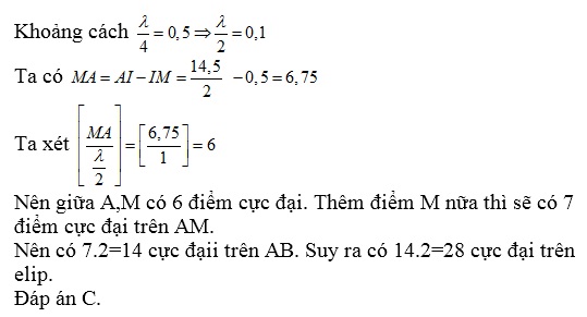Trong thí nghiệm giao thoa sóng trên mặt nước, hai nguồn AB cách nhau 14,5cm dao động ngược pha Điểm M trên AB gần trung điểm I của AB nhất, cách I là 0,5cm luôn dao động cực đại. Số điểm dao động cực đại trên đường elíp thuộc mặt nước nhận A, B làm tiêu điểm là