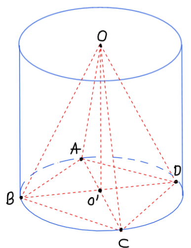 Cho khối trụ có trục \(OO' = 3a\). Một khối chóp đều O.ABCD có thể tích bằng \(2{a^3}\) và đáy