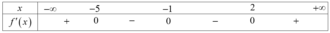 Cho hàm số \(y = f\left( x \right)\) có đạo hàm \(f'\left( x \right) = \left( {x - 2} \right)\left( {x + 5} \right){\left( {x + 1} \right)^2}.\) Hàm số \(y = f\left( x \right)\) nghịch biến trên khoảng nào dưới đây?