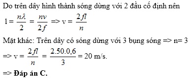 Một dây đàn hồi AB dài 60 cm có đầu B cố định, đầu A mắc vào một nhánh âm thoa đang dao động với tần số f=50 Hz. Khi âm thoa rung, trên dây có sóng dừng với 3 bụng sóng. Vận tốc truyền sóng trên dây là: