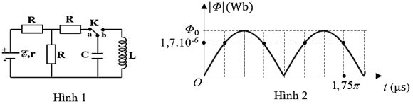 Dùng mạch điện như hình 1 để tạo ra dao động điện từ. Biết nguồn điện có suất điện động E, điện trở trong r = 1Ω; cuộn dây thuần cảm; điện trở R = 2Ω. Ban đầu khóa K được đóng vào chốt a, khi dòng điện qua nguồn điện ổn định thì chuyển khóa K đóng sang chốt b. Chọn gốc thời gian (t = 0) là lúc khóa K được đóng vào chốt b. Đồ thị biểu diễn sự phụ thuộc của độ lớn từ thông riêng của cuộn dây theo thời gian được mô tả như hình 2. Suất điện động E của nguồn có giá trị gần nhất với giá trị nào sau đây