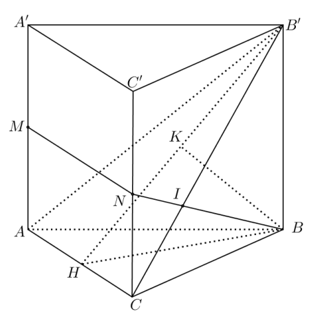 Gọi \(N\) là trung điểm CC’ và \(I = NB \cap B'C\). Chứng minh \(d\left( {M,\left( {AB'C} \right)} \right) = d\left( {N,\left( {AB'C} \right)} \right) = \dfrac{1}{2}d\left( {B,\left( {AB'C} \right)} \right)\).