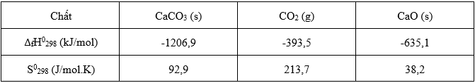Xét phản ứng nung vôi: CaCO3 (s) \(\xrightarrow{{{t^o}}}\) CaO (s) + CO2 (g) Biết các số liệu