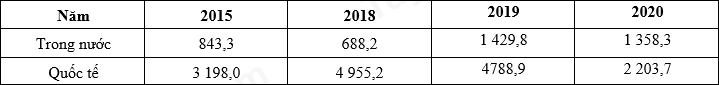 Theo bảng số liệu, đểthể hiện sự thay đổi cơ cấu khối lượng hàng hóa luân chuyển bằng đường hàng không nước ta giai đoạn 2015 - 2020, các dạngbiểu đồ nào sau đây là thích hợp?