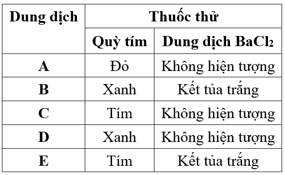 Có 5 dung dịch A, B, C, D, E là NaOH, HCl, Na2SO4, H2O, Na2CO3 ( không theo thứ tự trên). Kết quả của những thí nghiệm tìm hiểu về những dung dịch này được ghi trong bảng sau: