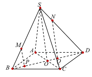 Cho hình chóp S.ABCD đáy là hình bình hành, O là tâm của đáy. Trên cạnh SB, SD lần lượt lấy điểm M; N sao cho SM = 2MB và \(\dfrac{{SN}}{{SD}} = \dfrac{1}{3}\). Hình chiếu của M; N qua phép chiếu song song đường thẳng SO lên mặt phẳng chiếu (ABCD) lần lượt là P; Q. Tính tỉ số \(\dfrac{{OP}}{{OQ}}\).