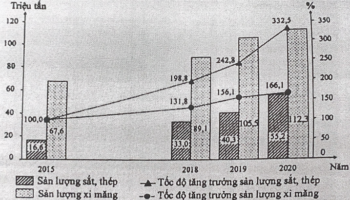Cho biểu đồ về sản xuất sắt, thép và sản xuất xi măng của nước ta giai đoạn 2015 - 2020: