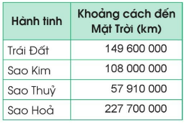 Khoảng cách từ Trái Đất, Sao Kim, Sao Thủy, Sao Hỏa đến Mặt Trời được biểu thị trong bảng bên. Hãy viết tên các hành tinh trên theothứ tự khoảng cách đến Mặt Trời từ xa nhất đến gần nhất.