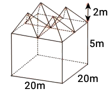 Người ta muốn lắp điều hoà cho một cái nhà kho bằng tôn hình lăng trụ tứ giác đều có mái che là bốn hình chóp tứ giác đều với kích thước đã cho trên hình. Tính thể tích của nhà kho để người ta có thể lắp số lượng điều hoà phù hợp.