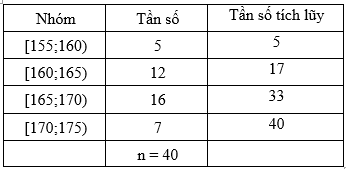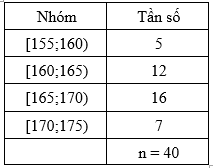 Xác định các số đặc trưng đo xu thế trung tâm cho mẫu số liệu ghép nhóm như ở Bảng sau