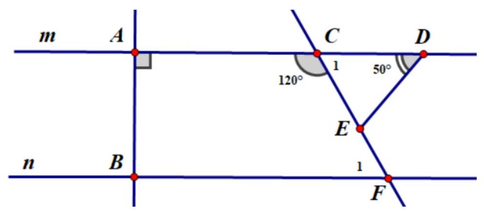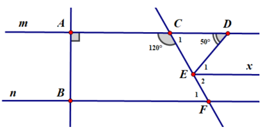Cho hình vẽ, biết \(m//n;AB \bot m\); góc \(ACF = {120^ \circ }\); góc \(ADE = {50^ \circ }\);