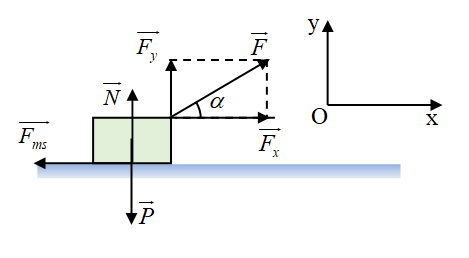 Một vật có khối lượng m = 50kg được kéo cho trượt trên mặt phẳng ngang bởi lực kéo \(\overrightarrow {{F_k}} \) không đổi làm với phương ngang một góc \(\alpha \) có \(\cos \alpha = 0,8\) có độ lớn là 116,3 N. Biết hệ số ma sát giữa vật và mặt phẳng ngang là 0,1, gia tốc rơi tự do là \(g = 10\,\,m/{s^2}\).
