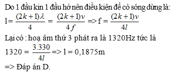 Tần số của hoạ âm thứ 3 do một ống sáo có một đầu kín, một đầu hở phát ra là 1320Hz. Tốc độ truyền âm trong không khí ở nhiệt độ này là 330m/s. Chiều dài của ống sáo là:
