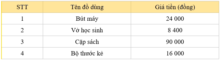 Giá tiền của một số đồ dùng học tập được cho như sau: