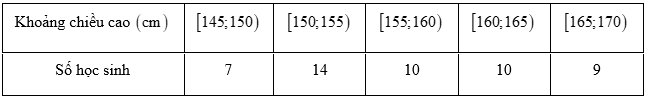 Bảng số liệu ghép nhóm sau cho biết chiều cao \(\left( {{\rm{cm}}} \right)\) của 50 học sinh lớp