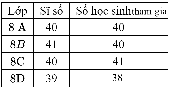 Bảng thống kê số lượng học sinh từng lớp ở khối 8 của một trường trung học cơ sở dự