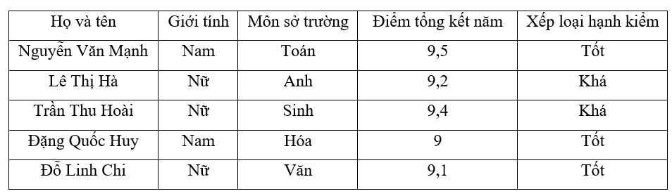 Kết quả top 5 bạn có điểm tổng kết năm học cao nhất của một trường THCS được cho bởi bảng thống kê sau: