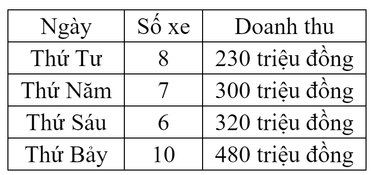 Thống kê số lượng xe máy bán được (loại có giá chưa đến 50 triệu đồng/xe) và doanh thu mỗi ngày trong 4 ngày cuối tuần của một cửa hàng điện máy.