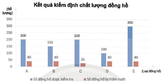 Từ biểu đồ cột kép trên, hãy tính tỉ số giữa số đồng hồ bị thấm nước và số đồng hồ đem kiểm tra của mỗi loại đồng hồ và đự đoán loại đồng hồ nào chống thấm nước tốt nhất.