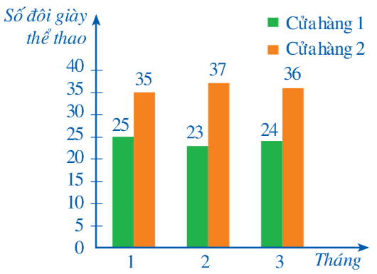 Cho biểu đồ cột kép dưới đây biểu diễn số đôi giày thể thao được bán ra trong Quý I năm 2022 của hai cửa hàng kinh doanh.