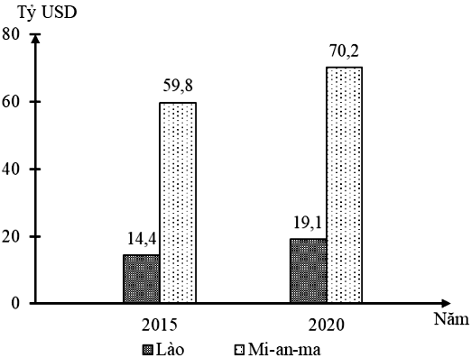 Cho biểu đồ: TỔNG SẢN PHẨM TRONG NƯỚC (GDP) CỦA LÀO VÀ MI-AN-MA NĂM 2015 VÀ 2020 (Nguồn số