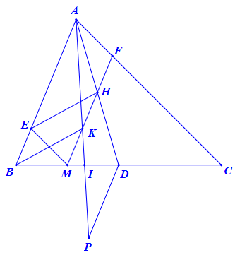 Cho tam giác ABC có AD là đường trung tuyến. Gọi M là điểm tùy ý thuộc khoảng BD. Lấy E thuộc AB và F thuộc AC sao cho \(ME\parallel AC{\rm{ }};{\rm{ }}MF\parallel AB\). Gọi H là giao điểm MF và AD. Đường thẳng qua B song song với EH cắt MF tại K. Đường thẳng AK cắt BC tại I. Tính tỉ số \(\dfrac{{IB}}{{ID}}\) ?
