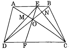 Cho hình thang ABCD có các đáy \(AB\parallel CD\). Gọi O là giao điểm của hai đường chéo. Lấy điểm E tùy ý trên đáy AB. Các đường thẳng EO, EC, ED cắt CD, AC, BD theo thứ tự F, M, N. Chứng minh rằng : \(\dfrac{{OE}}{{OF}} = \dfrac{{EM}}{{DM}} + \dfrac{{\mathop {EN}\limits^. }}{{CN}}\).