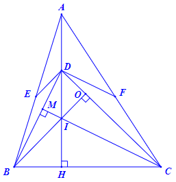 Do vậy cần chứng minh tỉ lệ thức \(\dfrac{{AB}}{{AE}} = \dfrac{{AC}}{{AF}}\). Nhận thấy để định hướng tỉ lệ thức ấy cũng như khai thác được \(\angle EDC = \angle FDB = {90^0}\) chúng ta cần kẻ \(BO \bot CD\); \(CM \bot DB\), để có các đường thẳng song song rồi vận dụng định lý Ta-let.