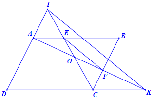 Cho hình bình hành ABCD, điểm E thuộc cạnh AB, diểm F thuộc cạnh BC. Gọi I là giao điểm của CE và AD, gọi K là giao điểm của AF và DC. Chứng minh rằng EF song song với IK.