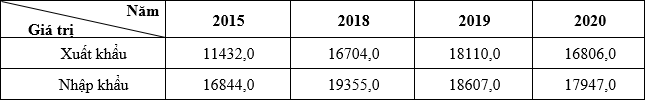 Cho bảng số liệu: GIÁ TRỊ XUẤT KHẨU, NHẬP KHẨU CỦA MI-AN-MA, GIAI ĐOẠN 2015 - 2020 (Đơn vị: