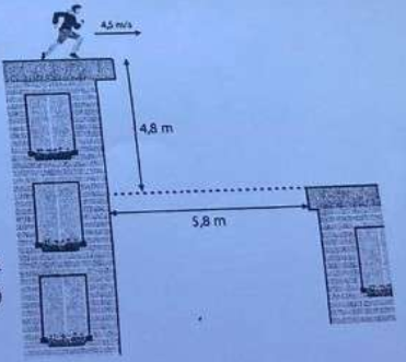Một người diễn viên đóng thế, phải đóng một cảnh quay chạy trên mái một ngôi nhà rồi nhảy theo phương ngang sang mái ngói một ngôi nhà khác. Để an toàn, đoàn làm phim tiến hành đo đạc các khoảng cách như trên hình vẽ. Lấy \(g = 9,8\,\,m/{s^2}\).