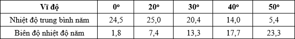 Cho bảng số liệu: NHIỆT ĐỘ TRUNG BÌNH NĂM VÀ BIÊN ĐỘ NHIỆT ĐỘ NĂM THEO VĨ ĐỘ Ở BÁN CẦU