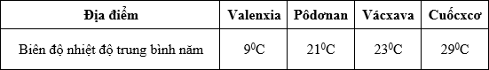 Cho bảng số liệu: BIÊN ĐỘ NHIỆT ĐỘ NĂM CỦA MỘT SỐ ĐỊA ĐIỂM TRÊN THẾ GIỚI(Nguồn: