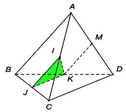 Cho tứ diện \(ABCD\). Gọi \(I,J,{\rm{\;K}}\) lần lượt là trung điểm của \(AC,BC\) và \(BD\). Giao