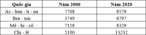 Cho bảng số liệu: GDP/người theo giá hiện hànhcủa một số quốc gia Mỹ Latinh năm 2000 và năm