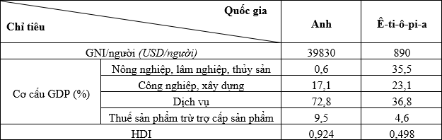 Cho bảng số liệu sau: GNI/người, cơ cấu GDP và HDI của Anh và Ê-ti-ô-pi-a năm 2020 Cho biết