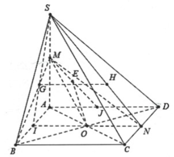 d) Gọi \(J\) là trung điểm \(AD,E \in MJ\), chứng minh rằng \(OE//(SCD)\).