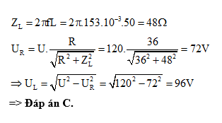 Điện trở thuần R = 36Ω nối tiếp với cuộn dây thuần cảm có L = 153mH và mắc vào mạng điện 120V, 50Hz. Ta có: