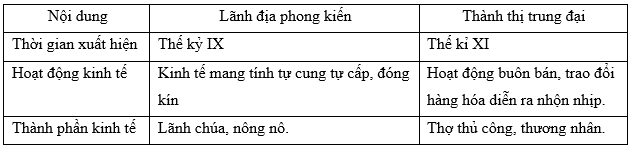 Lập bảng so sánh đặc điểm của lãnh địa phong kiến và thành thị Tây Âu thời Trung đại.