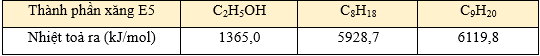 Xăng E5 là một loại xăng sinh học, được tạo thành khi trộn 5 thể tích C2H5OH (D = 0,8 g/mL) với 95 thể tích xăng truyền thống. Giả sử xăng truyền thống chỉ chứa hai alkane C8H18 và C9H20 (tỉ lệ mol tương ứng 3: 4, D = 0,7 g/mL). Biết nhiệt lượng toả ra khi đốt cháy 1 mol các chất trong xăng E5 như sau:
