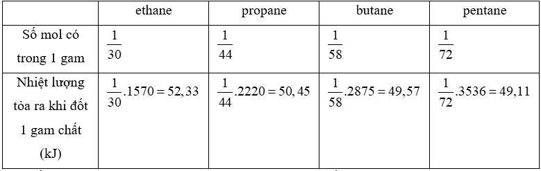 Cho nhiệt đốt cháy hoàn toàn 1 mol các chất ethane, propane, butane và pentane lần lượt là 1570 kJ/mol; 2220 kJ/mol; 2875 kJ/mol và 3536 kJ/mol. Khi đốt cháy hoàn toàn 1 gam chất nào sẽ thu được lượng nhiệt lớn nhất?
