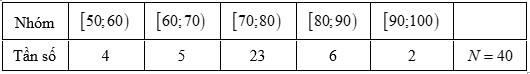 Người ta tiến hành phỏng vấn 40 người về một mẫu áo khoác. Người điều tra yêu cầu cho điểm mẫu áo đó theo thang điểm là 100 . Kết quả được trình bày trong bảng ghép nhóm sau: