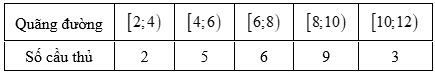 Quãng đường \(\left( {{\rm{km}}} \right)\) các cầu thủ (không tính thủ môn) chạy trong một trận